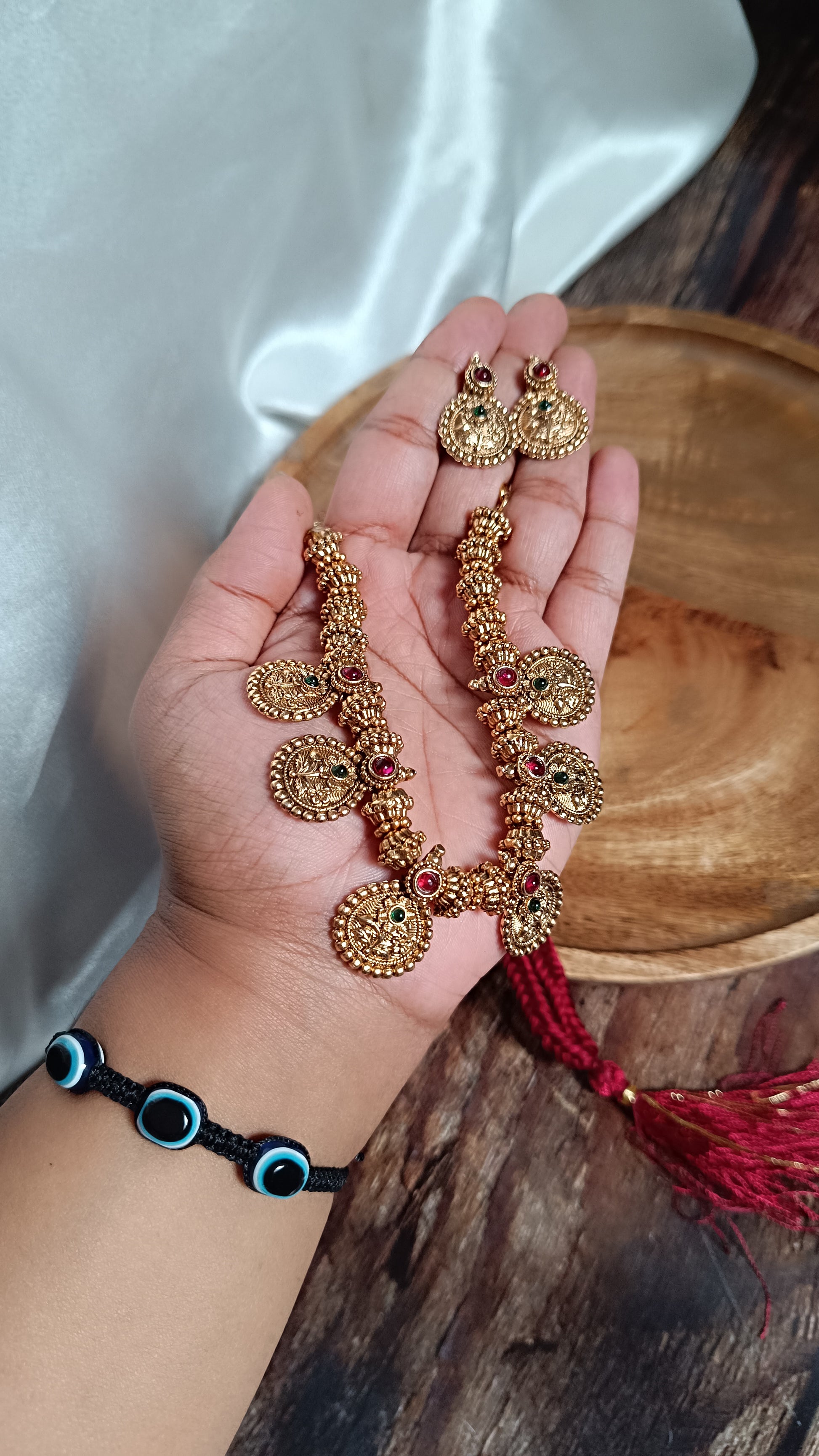 Step into timeless tradition with this Antique Non-Idol Coin Necklace Set, featuring exquisite coin motifs highlighted with ruby and emerald stones. The rich antique finish adds a regal touch, while the intricate detailing makes it a perfect blend of heritage and elegance. Paired with matching earrings, this set is designed to complete your festive and bridal looks.